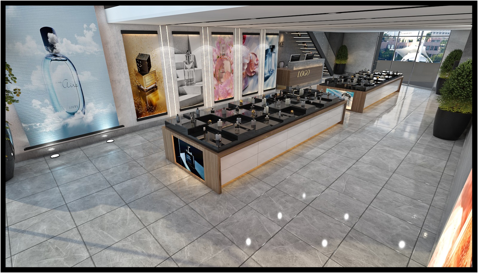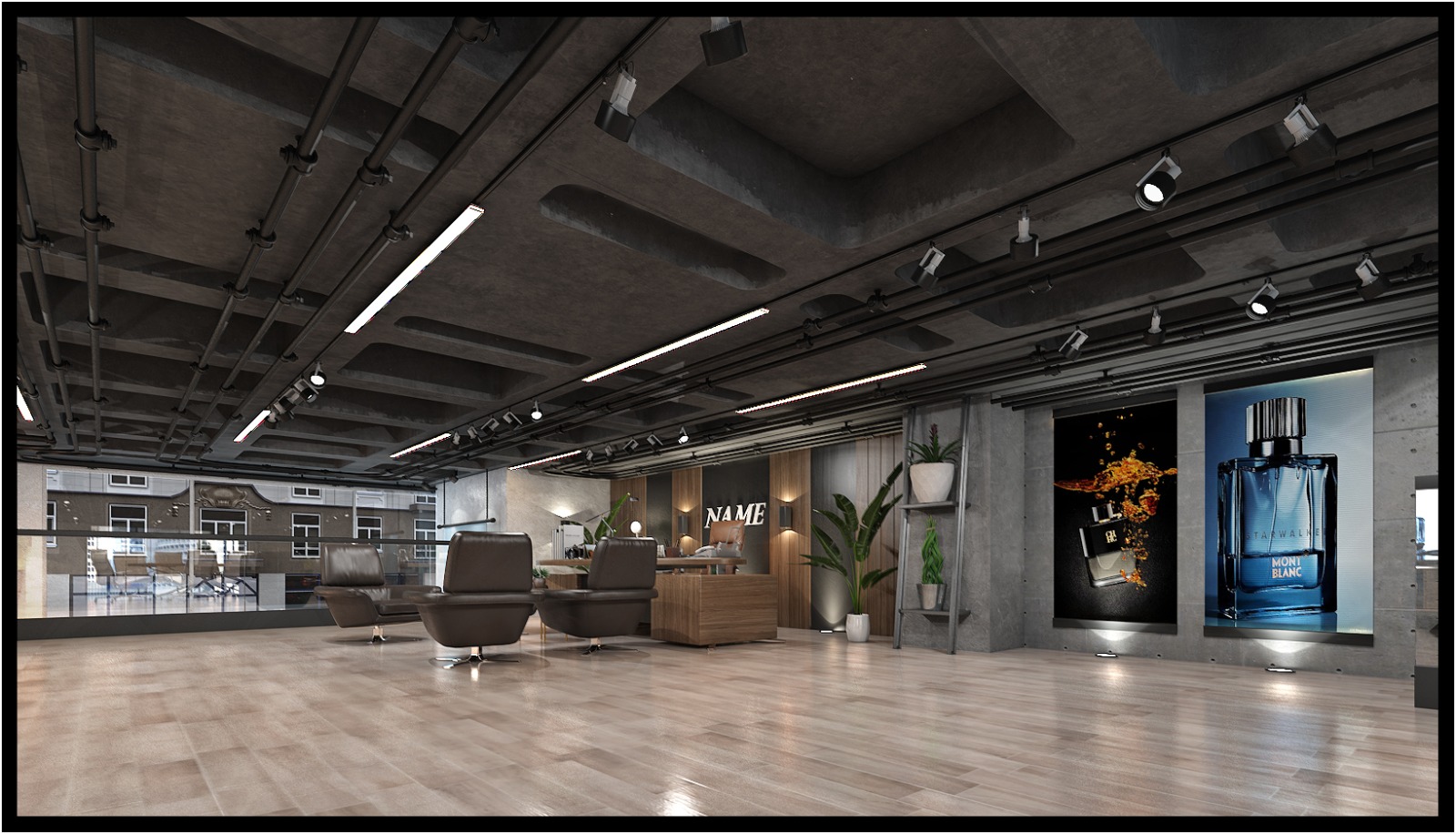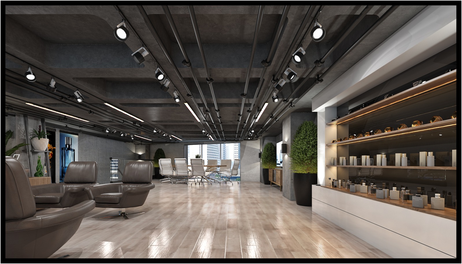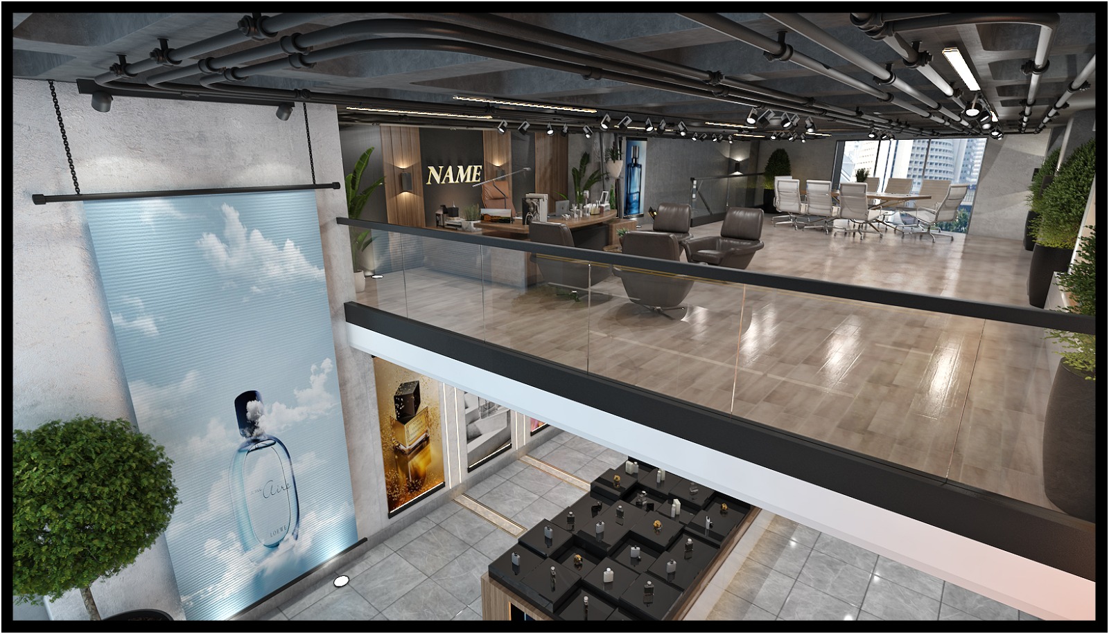 The final result is a modern industrial perfume company interior that combines strong branding, functional layout, and a refined customer experience.