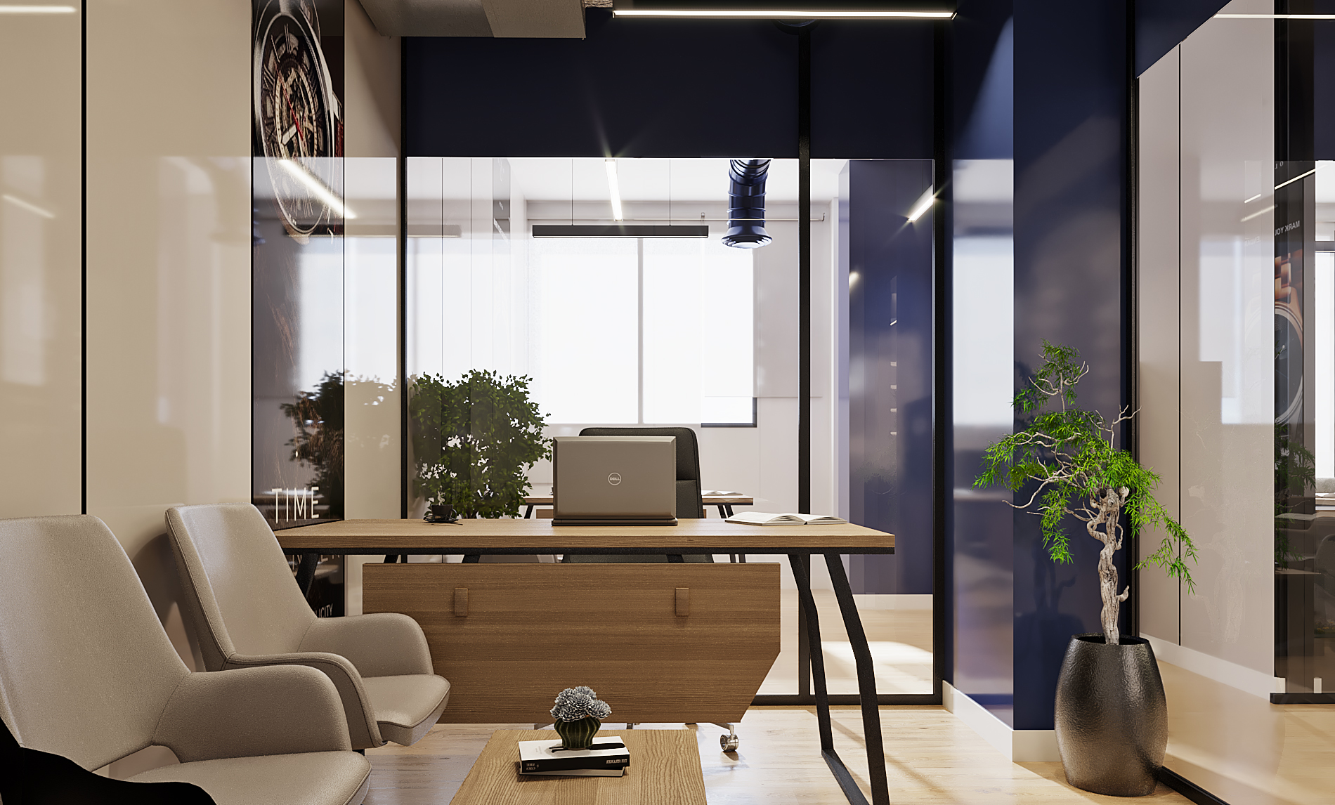 Wood flooring adds warmth and comfort. In addition, transparent glass defines office boundaries. Black metal elements reinforce the industrial theme. Meanwhile, natural plants introduce freshness. Therefore, materials feel balanced and functional.