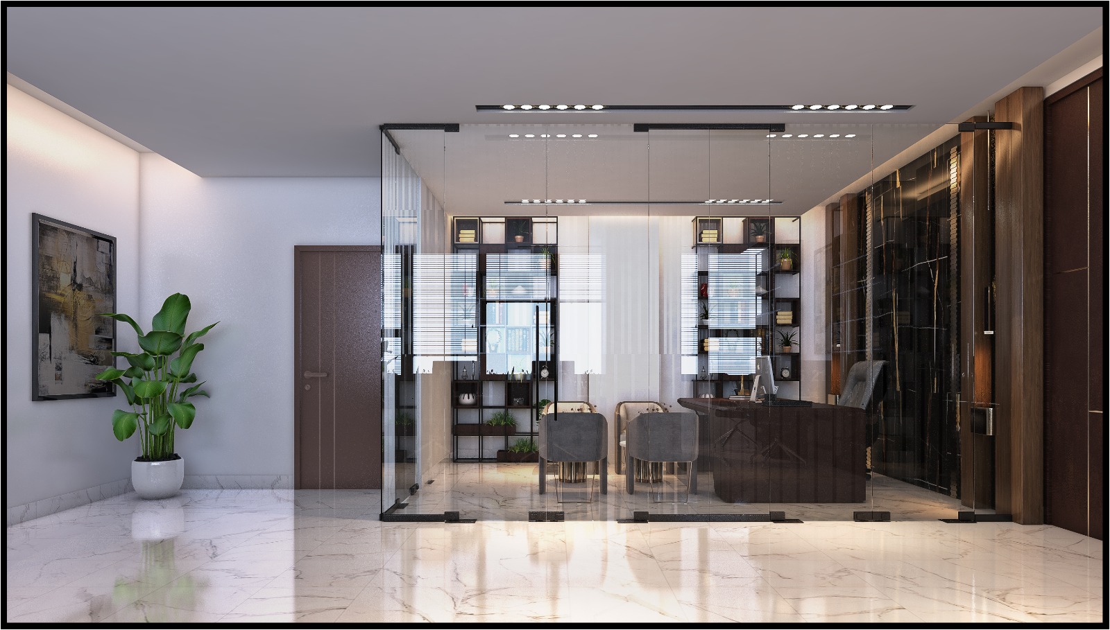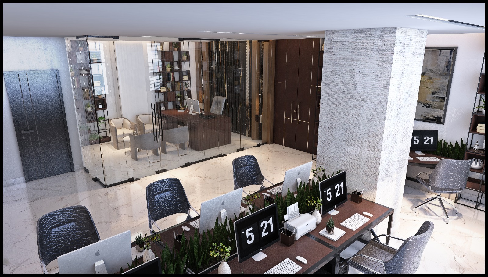 The project includes a luxurious executive office designed to convey authority and brand strength, alongside an open reception area visually connected to the staff workspaces. This layout promotes transparency and creates a welcoming first impression.