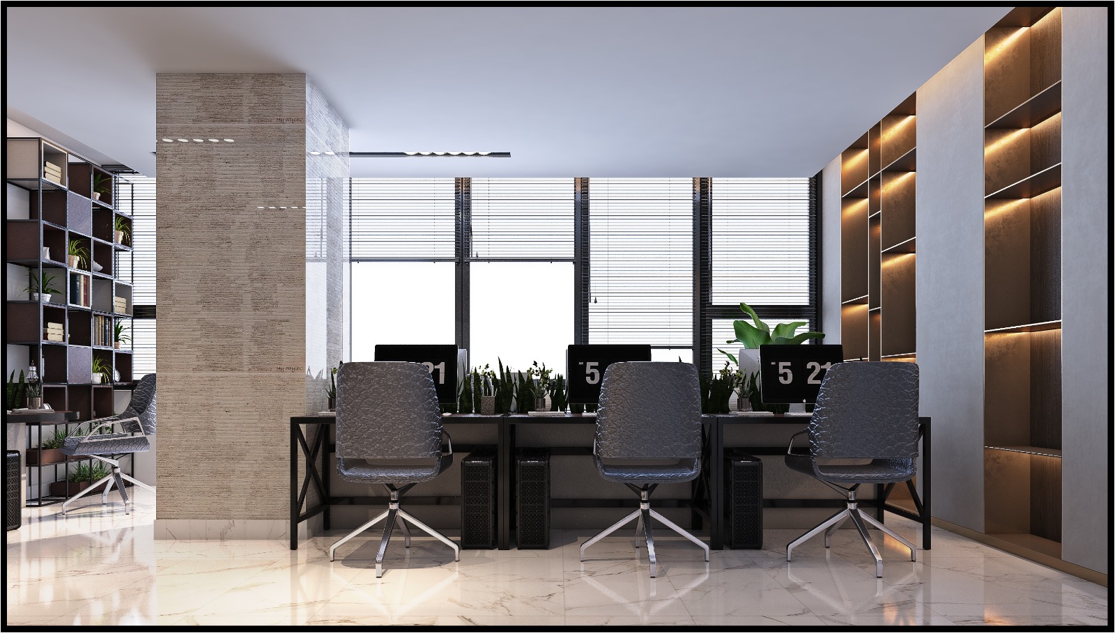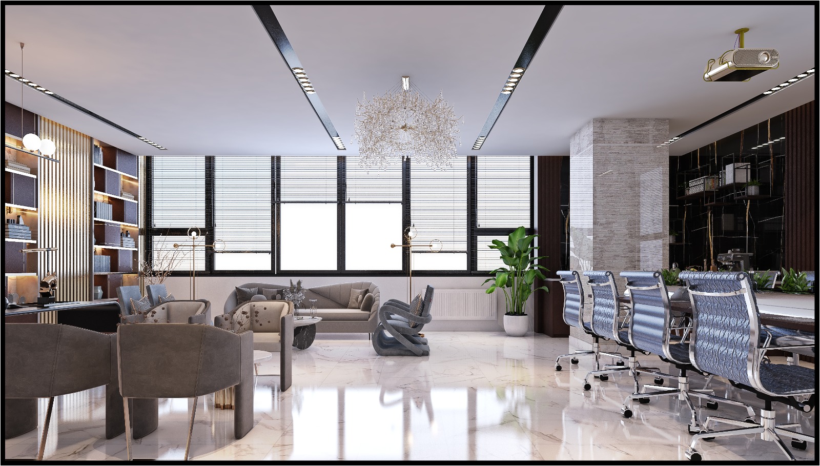 High-end porcelain flooring was selected for its elegant appearance, durability, and ease of maintenance, contributing to a refined and spacious atmosphere. Walls were finished with decorative chipboard panels, complemented by custom wooden libraries that add warmth, texture, and a professional corporate identity.