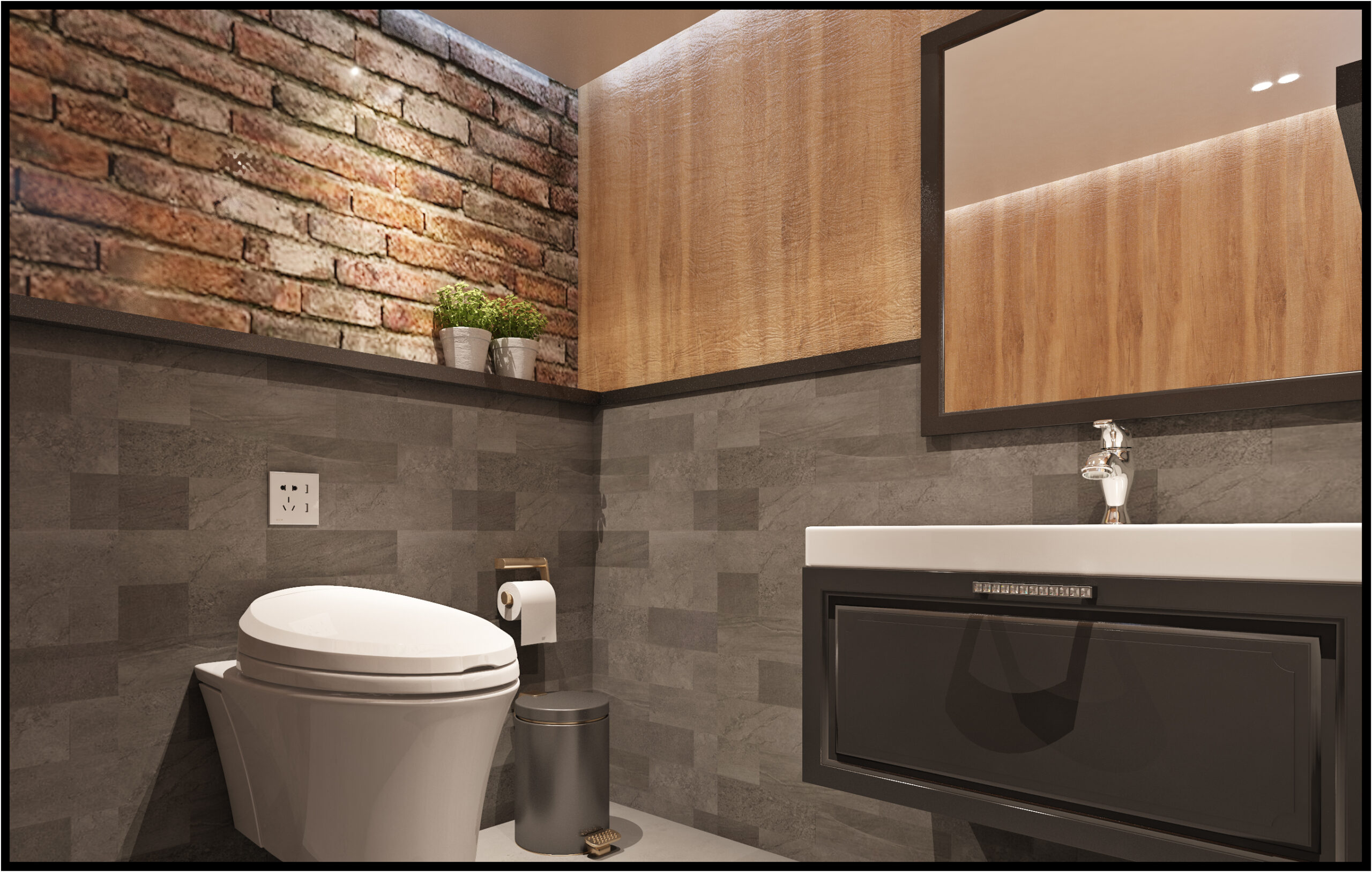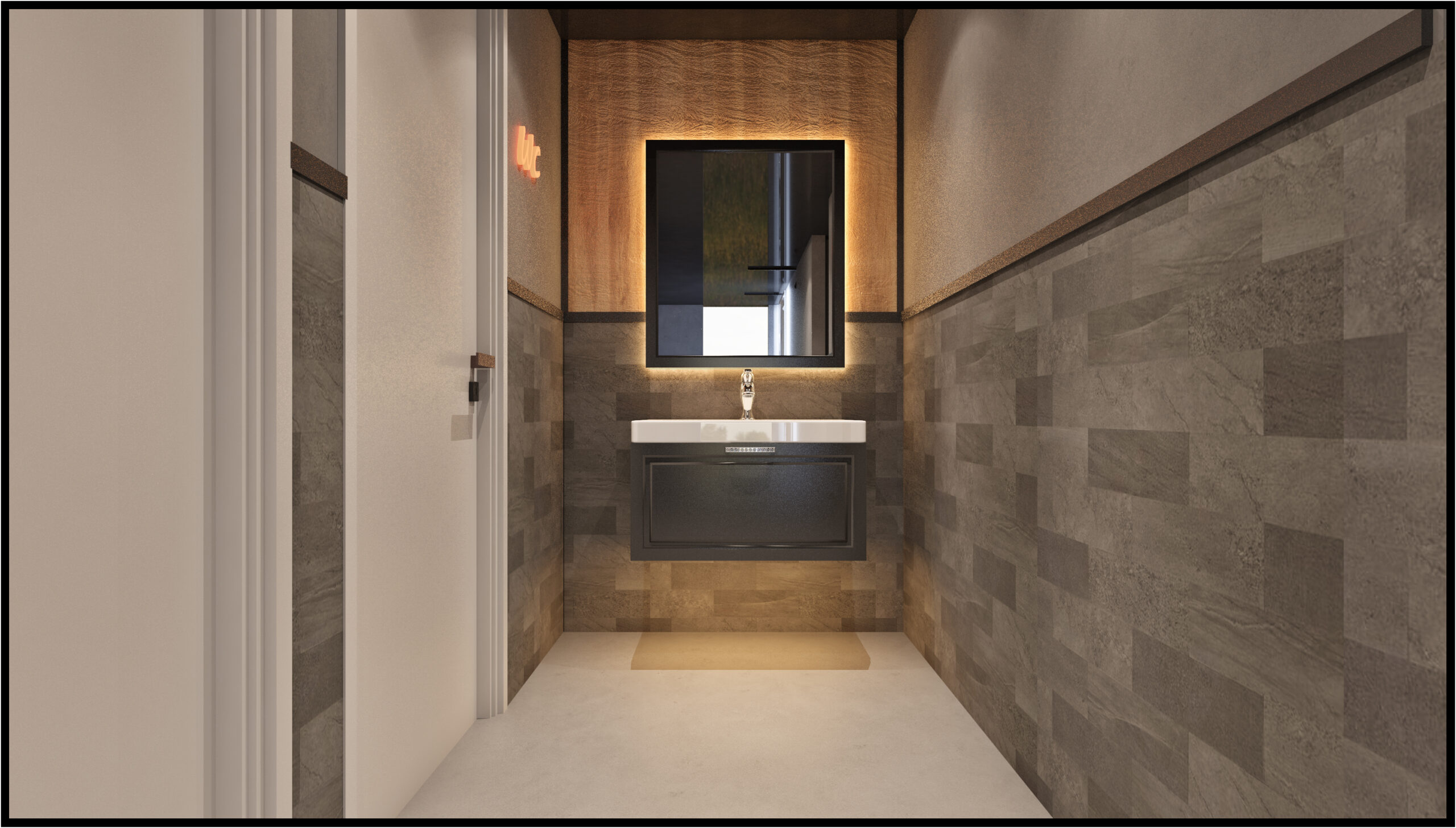 The design combines industrial elements with modern finishes, featuring dark open ceilings, linear lighting systems, and warm wooden surfaces that create visual balance. Illuminated wooden counters and natural textures add warmth while maintaining a bold urban character.