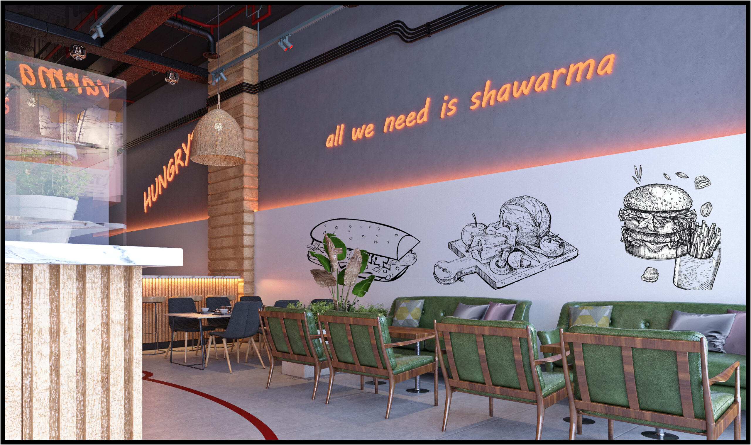 This fast food restaurant interior design in Istanbul for Foodies presents a modern concept that blends energy, comfort, and strong brand identity. The interior was designed to meet contemporary fast food standards, focusing on customer experience and smooth circulation within a spacious 200 sqm layout.