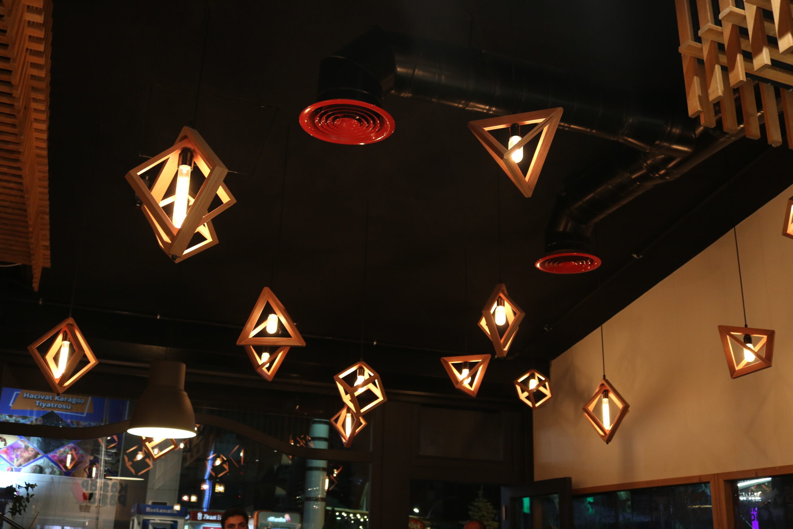 Lighting reinforces the brand identity. Therefore, red electrical drop pendants act as bold focal elements. Moreover, they create strong contrast against the black ceiling. In addition, strategic lighting enhances product presentation. Finally, the atmosphere feels dynamic and distinctive.