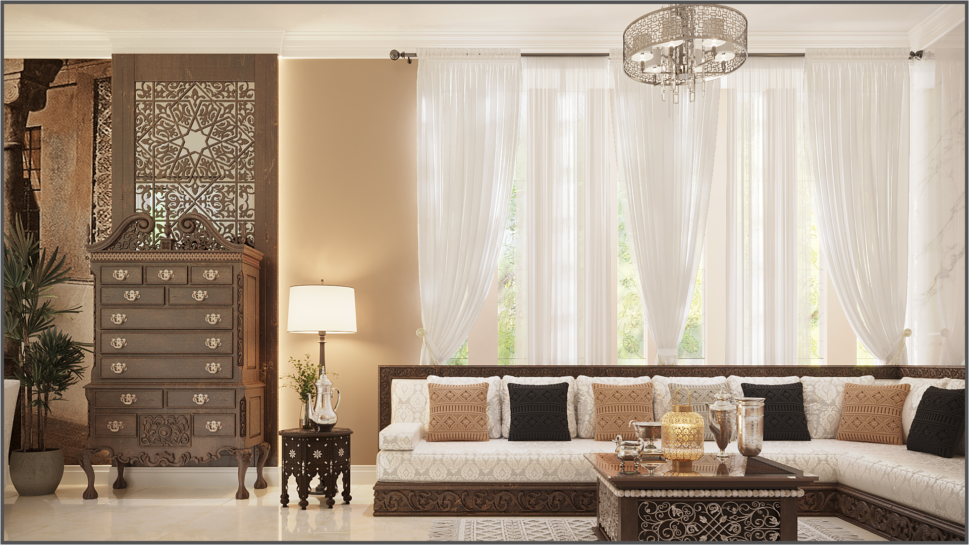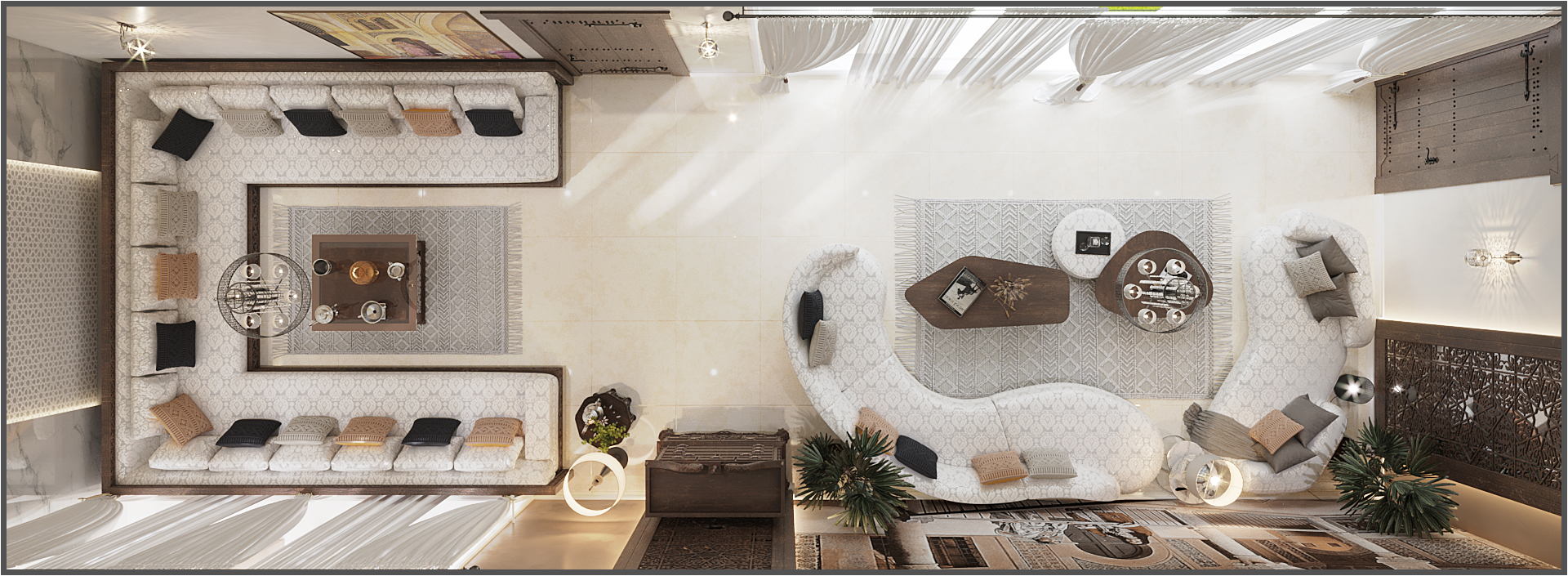 The men’s majlis emphasizes formality and traditional hospitality through refined materials and balanced color palettes. In contrast, the women’s majlis offers a softer and more intimate atmosphere. Therefore, the design prioritizes comfort, decorative detailing, and layered lighting. Meanwhile, the guest majlis functions as an independent reception area that blends heritage character with modern comfort.