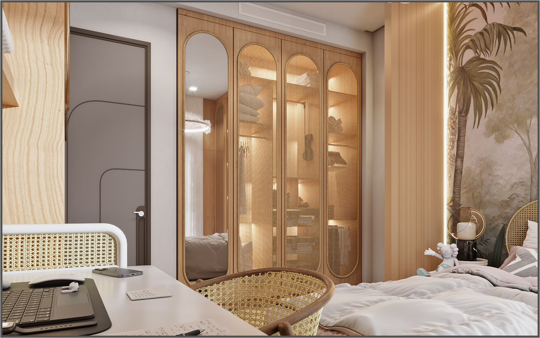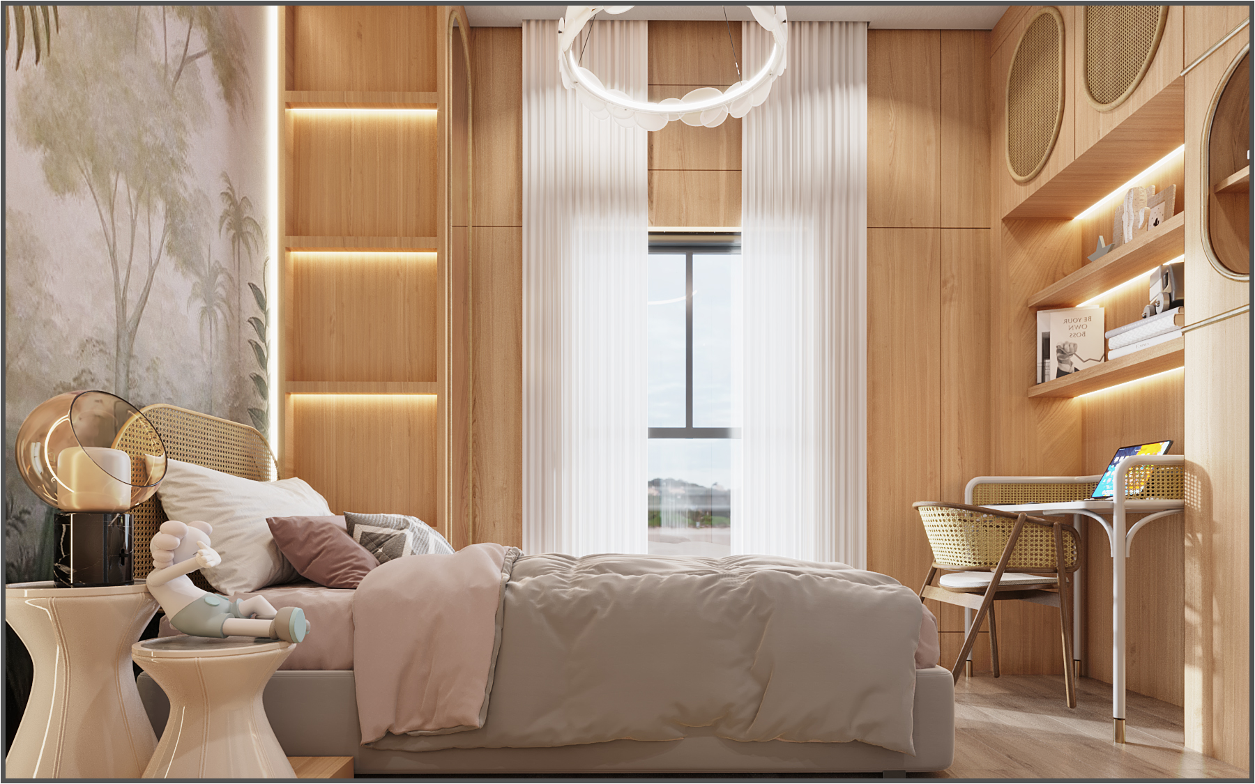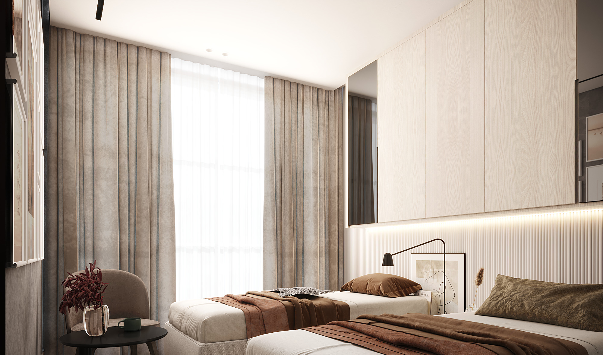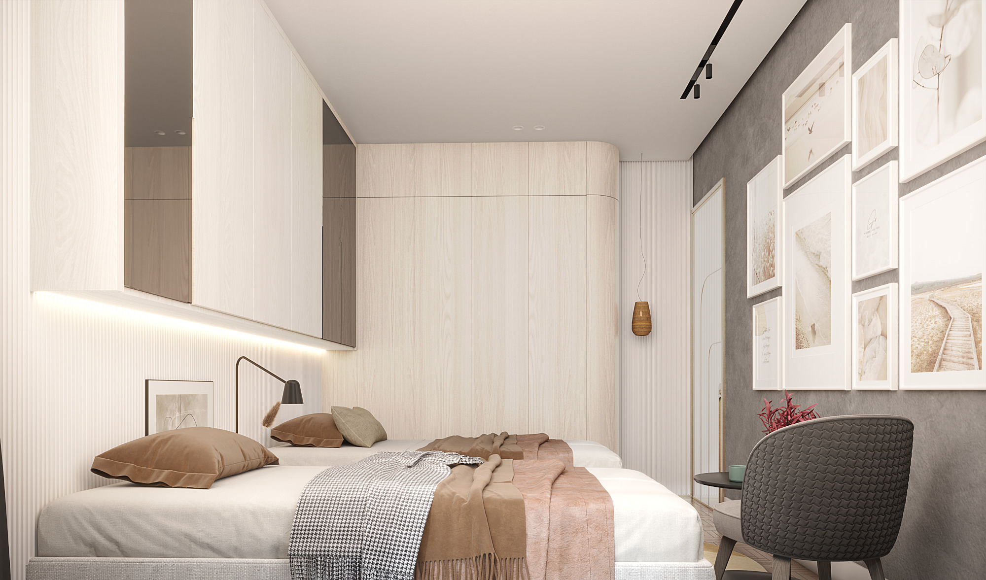 Curved architectural elements define both the guest living area and the master bedroom. These soft lines reduce sharp edges and create a seamless modern flow. Moreover, marble and natural wood TV units act as refined focal points that elevate the overall aesthetic.