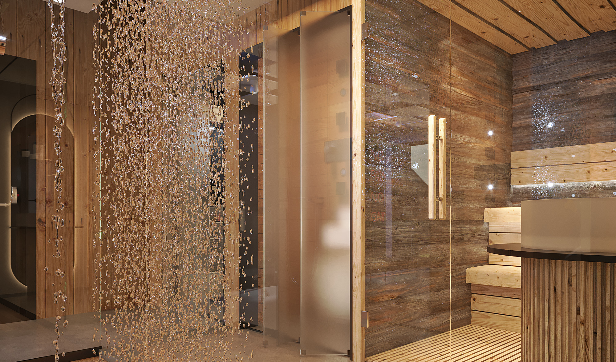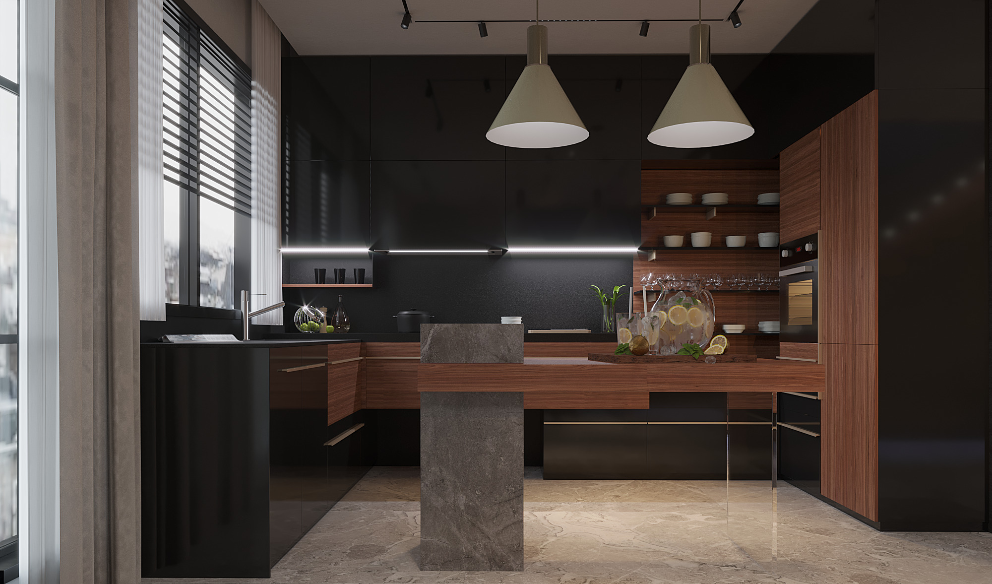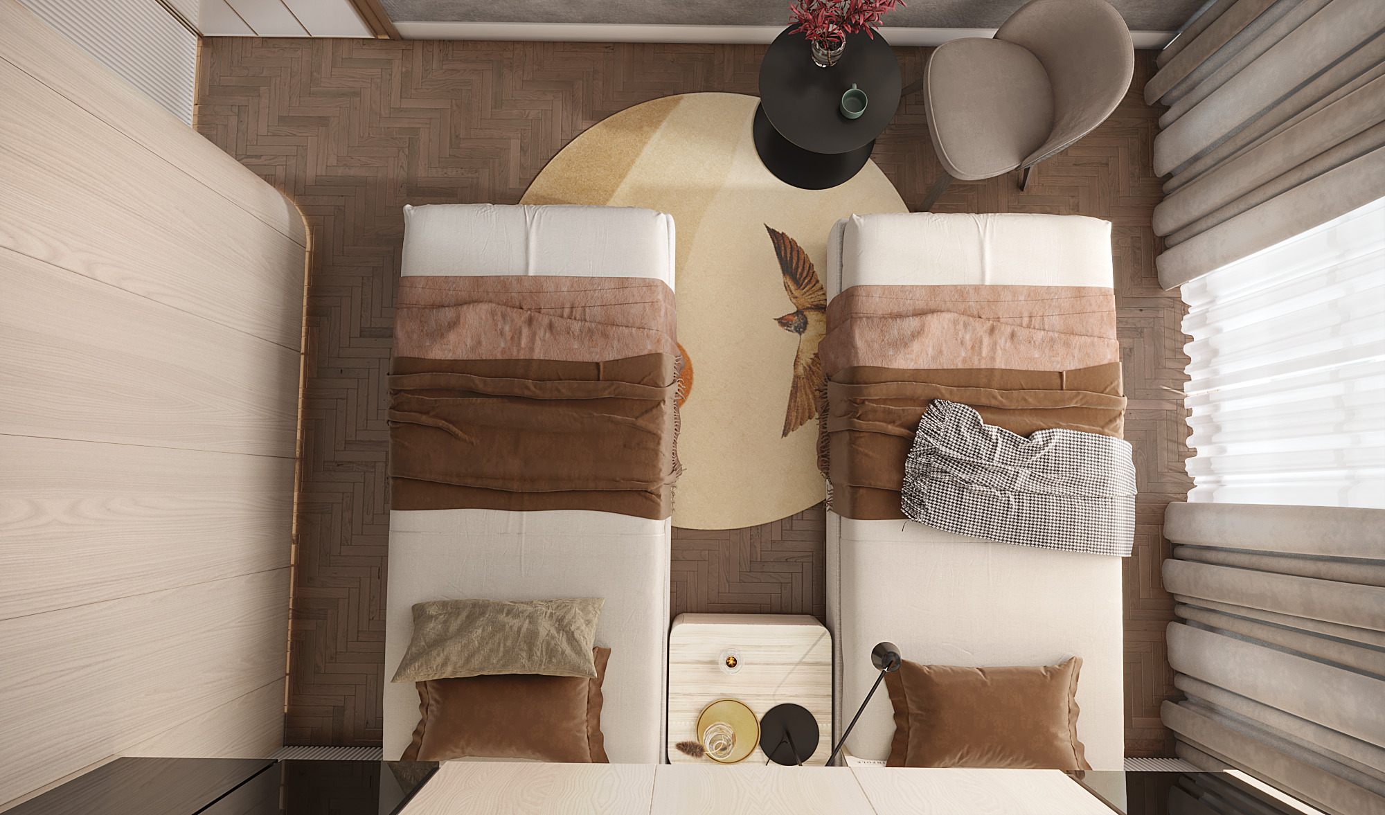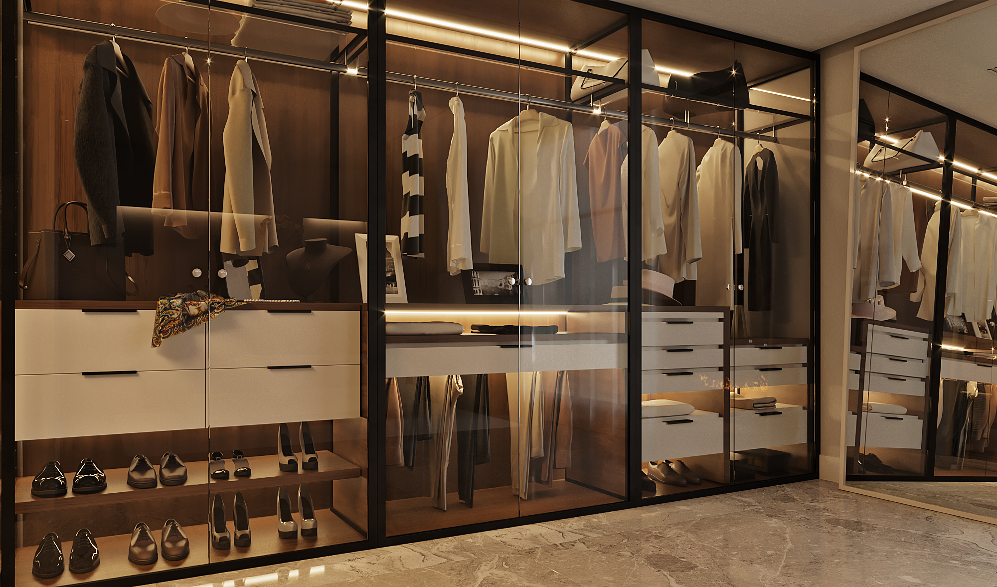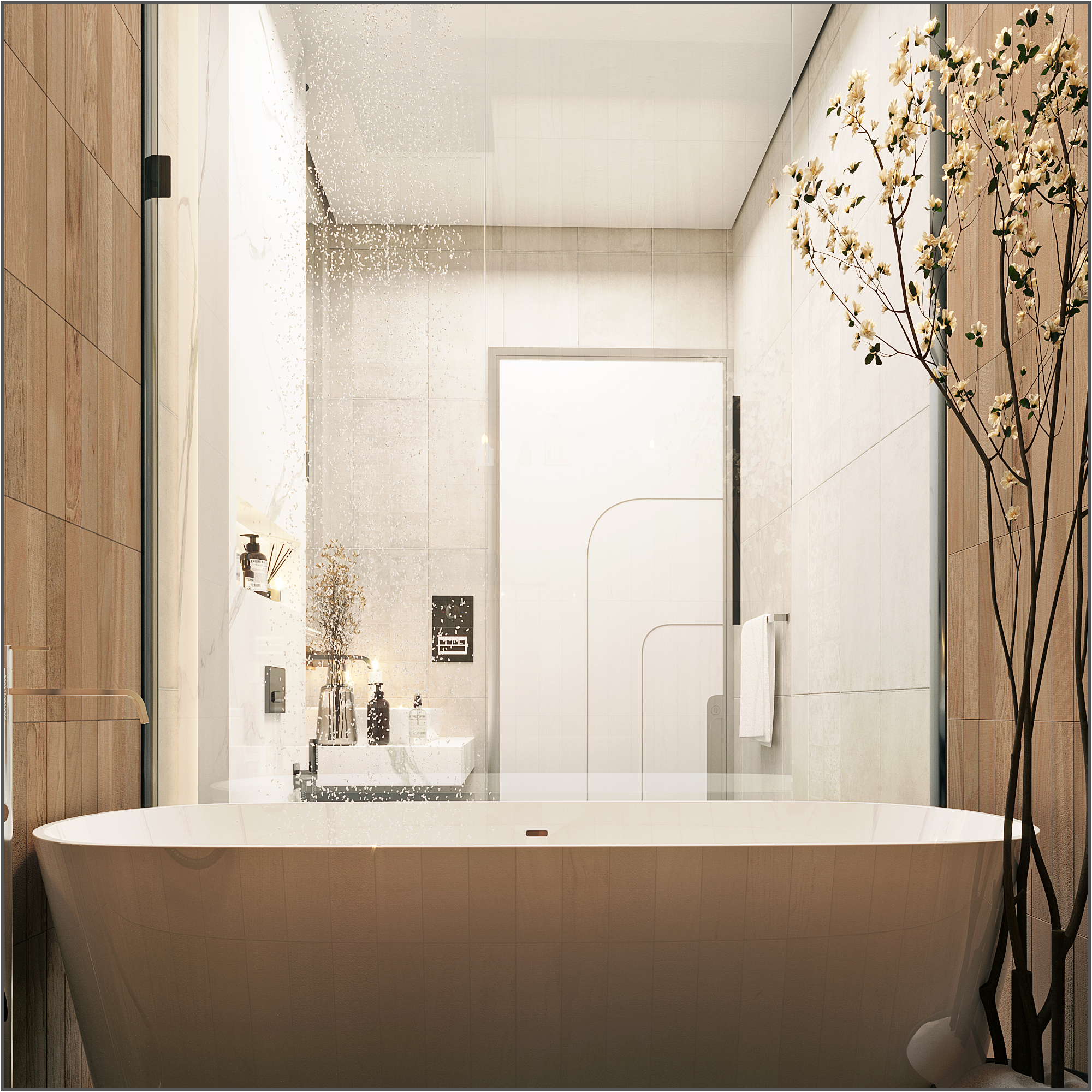 Curved architectural elements define both the guest living area and the master bedroom. These soft lines reduce sharp edges and create a seamless modern flow. Moreover, marble and natural wood TV units act as refined focal points that elevate the overall aesthetic.