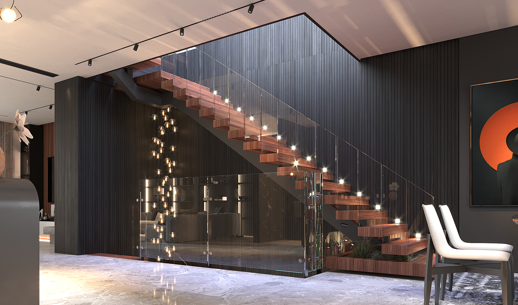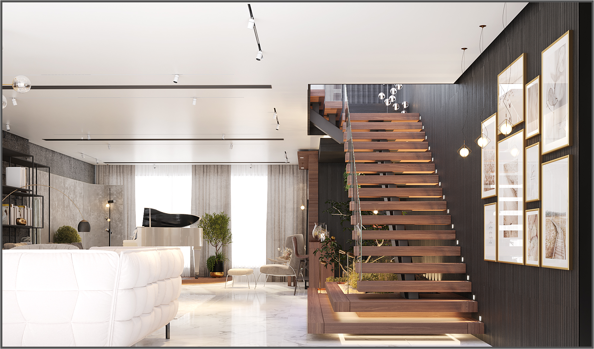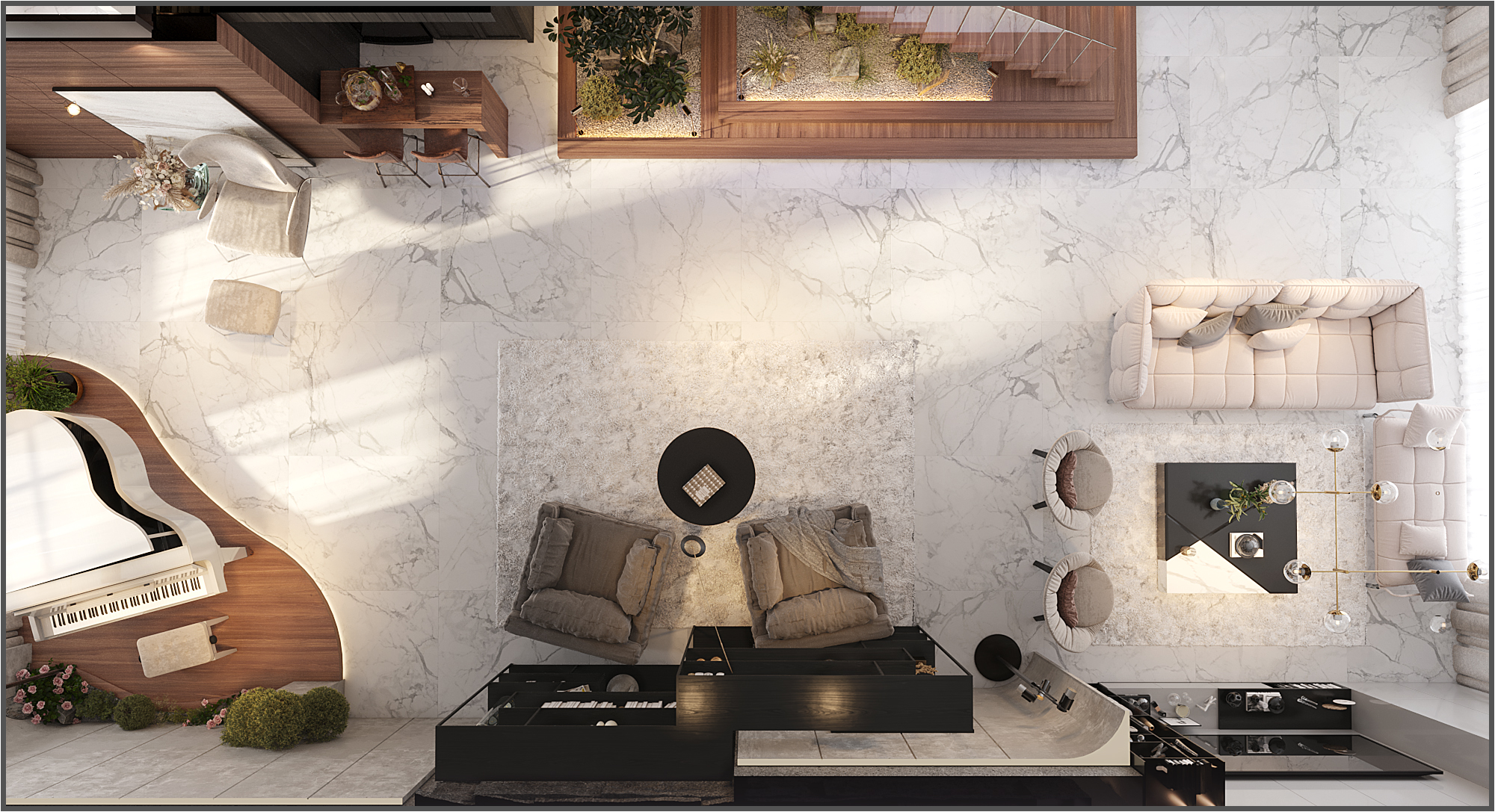 The ground floor welcomes guests through a formal reception area. A classic piano and integrated indoor landscaping add character and elegance. The first floor functions as the family living zone, where an open kitchen connects directly to the dining area for daily comfort and interaction.
