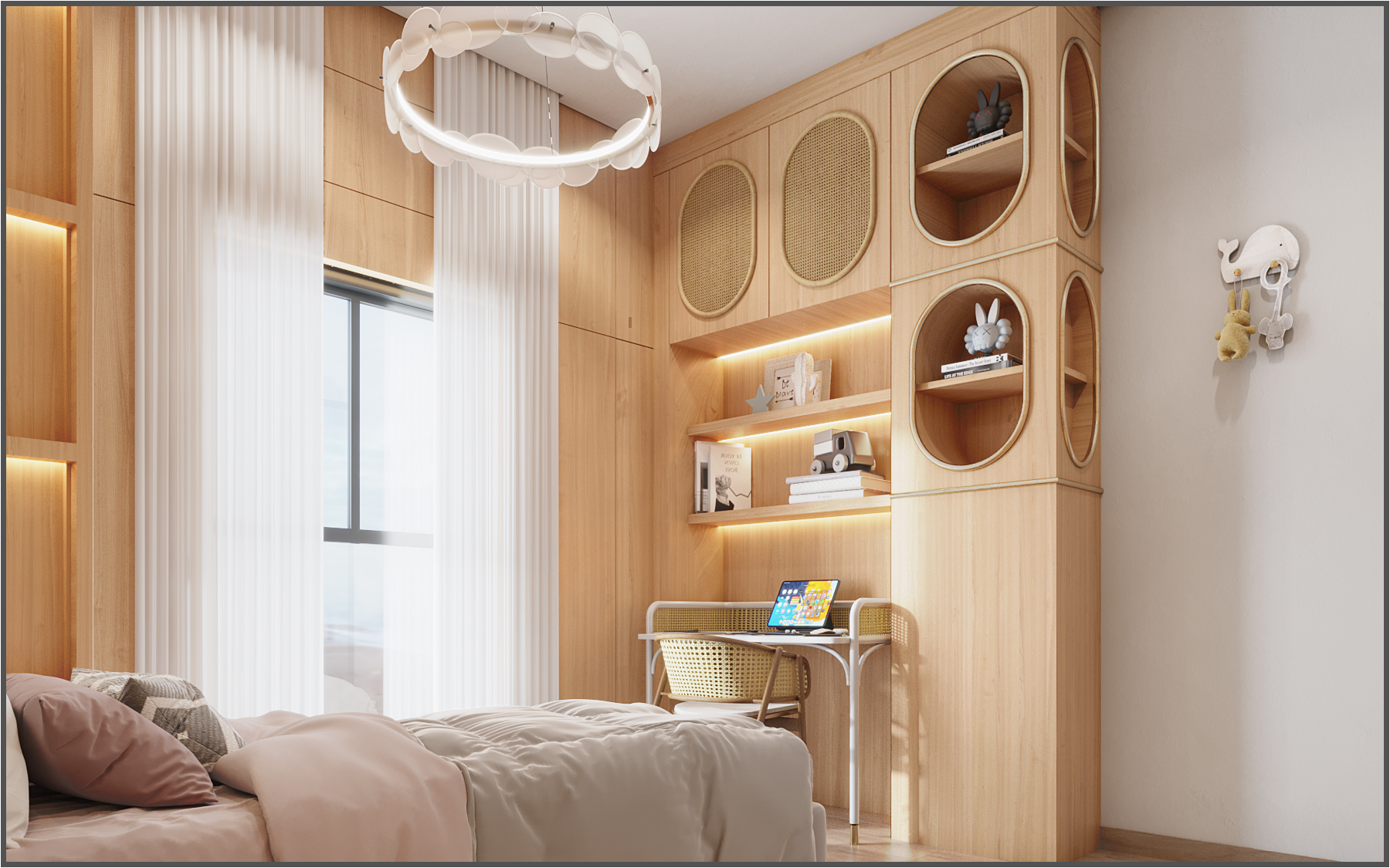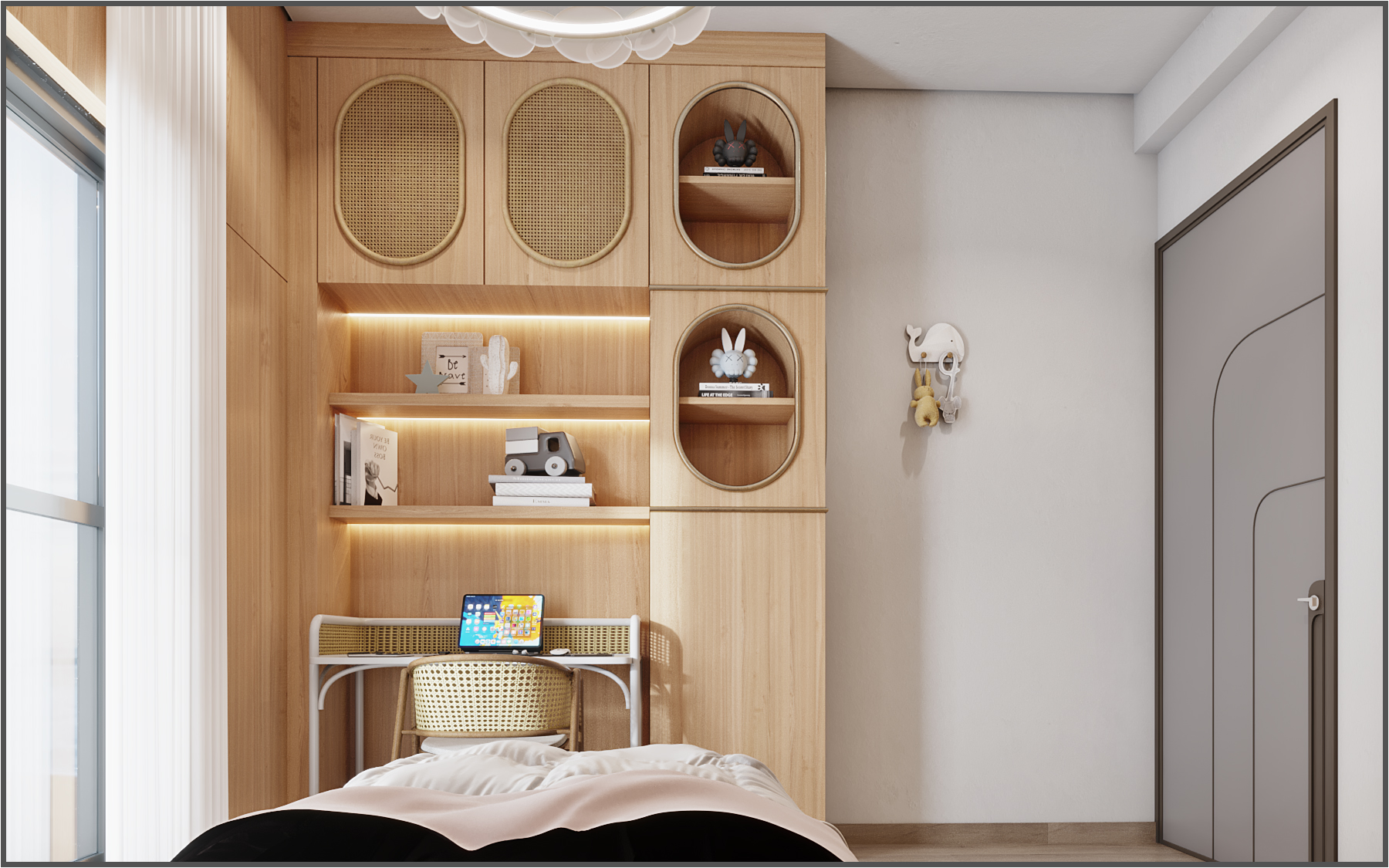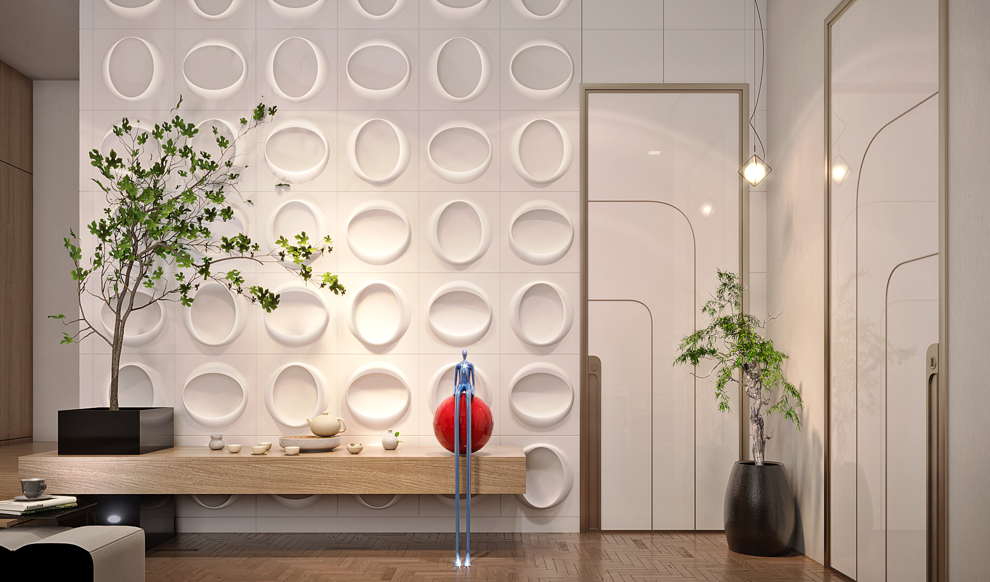 Natural wood finishes play a key role throughout the interior, adding warmth and visual balance. In addition, high-quality porcelain flooring enhances durability and reinforces the villa’s modern elegance. Decorative wall finishes further enrich the spaces by introducing texture and depth without overwhelming the design.