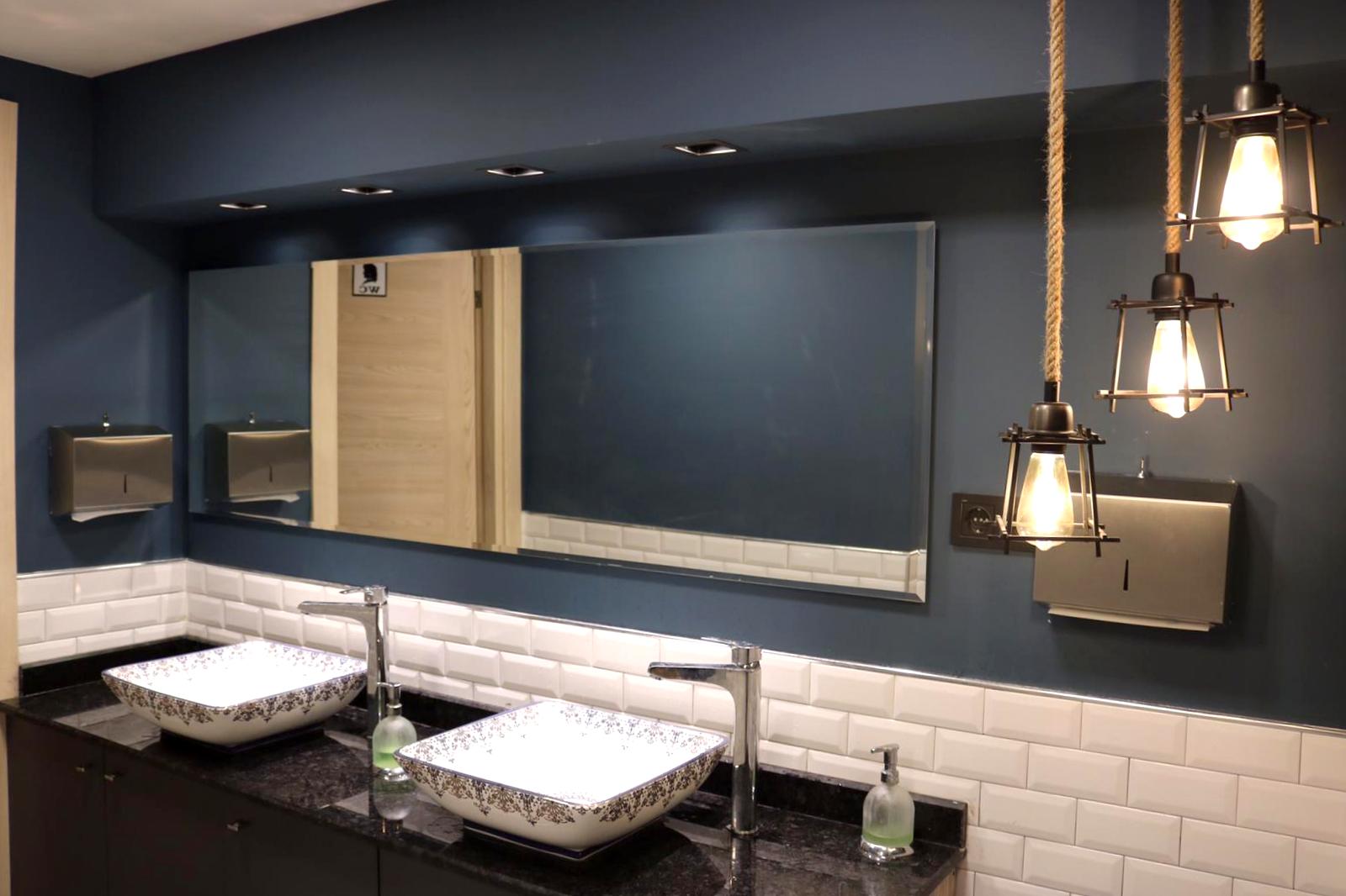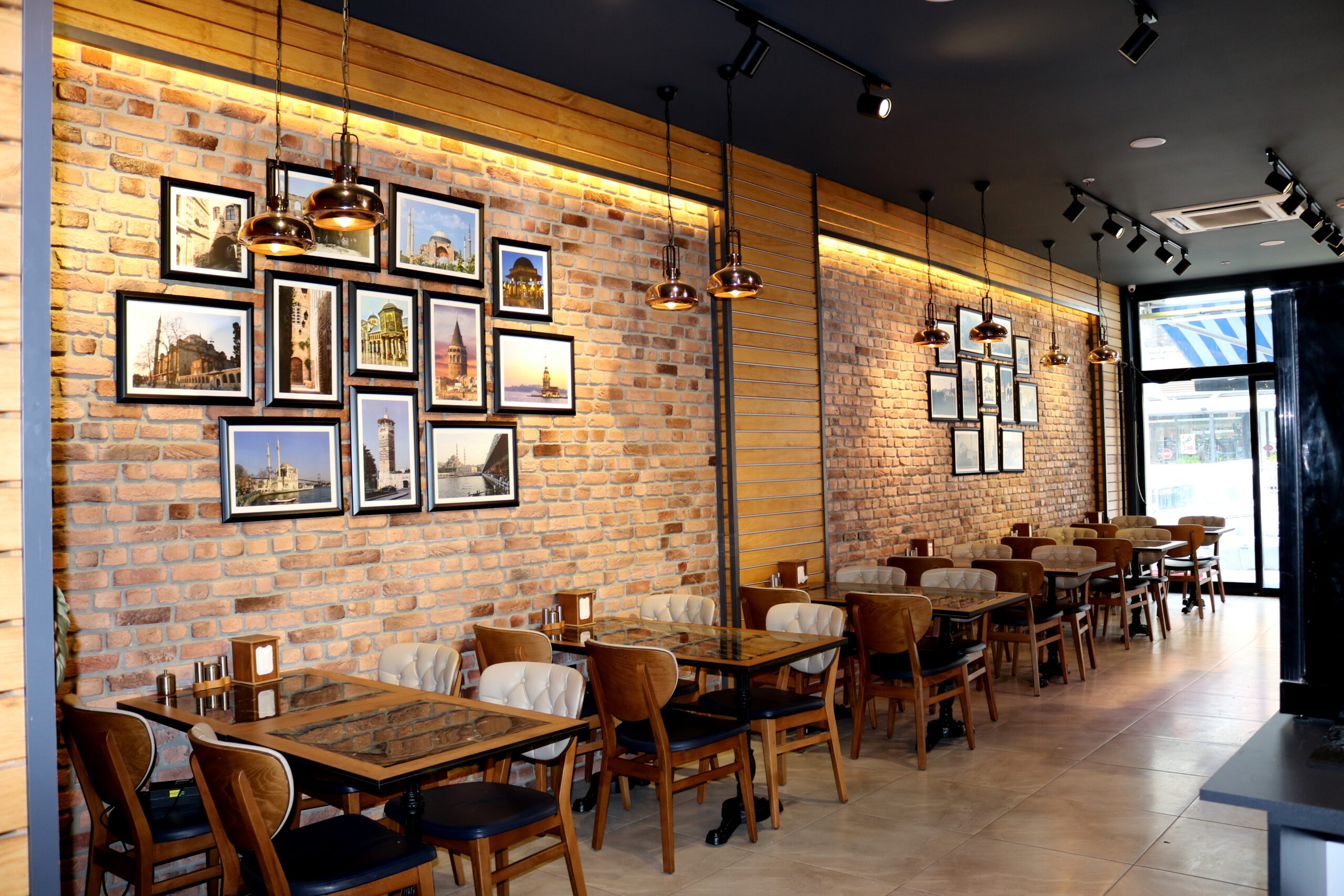 Brick stone walls were selected as a primary design element, giving the space a warm yet contemporary character, complemented by decorative wall artworks that enhance the overall atmosphere.